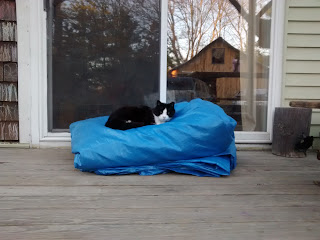 Thadius was outside and immediately greeted us. He also apparently has enjoyed the huge folded up house tarp on the front porch while we were gone.